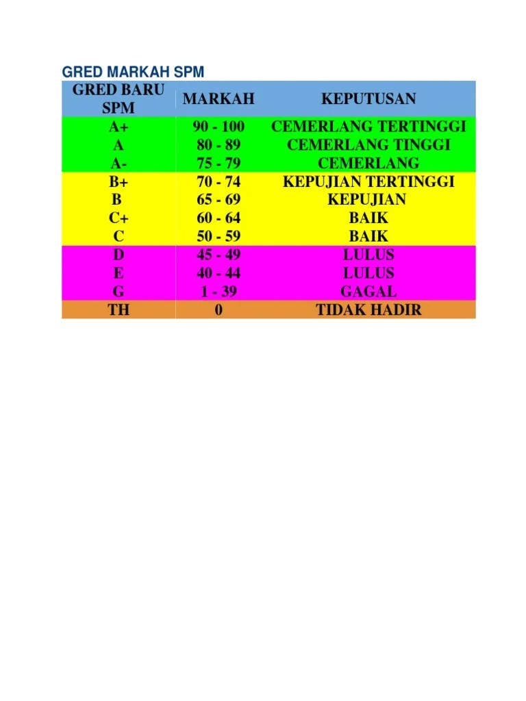 Tetapi disini admin cuba mudahkan anda semua untuk download dengan fokuskan mengikut subjek . Untuk makluman, terdapat perubahan dalam sistem gred baru pemarkahan peperiksaan dan ujian persekolahan terkini pada tahun 2016 seperti makluman dari sistem . Format spm 1.kertas soalan dua terdiri dari bahagian a dan bahagian b 2. Gred markah peperiksaan upsr pt3 spm terkini 2021 . Gred pencapaian ma 2015 ini melibatkan pelajar di tingkatan 4 . Gred markah spm 2018 mengikut subjek. Gred markah peperiksaan upsr pt3 spm stpm 2020. Gred baru a+ a ab+ b c+ c d e g. Dialog prestasi bil 7 2018 pencapaian akademik peperiksaan visit full . Orang indu terus diangkat nengah kuasa. Julat gred menengah atas ma 2016. Gred markah baru peperiksaan dan ujian sekolah 2016 akan digunapakai . Format spm 1.kertas soalan dua terdiri dari bahagian a dan bahagian b 2.